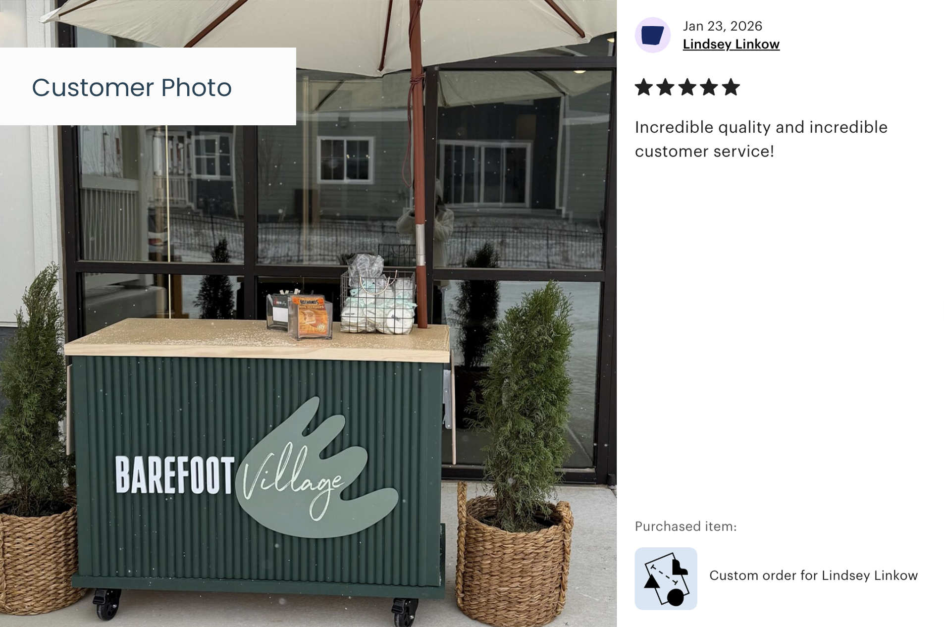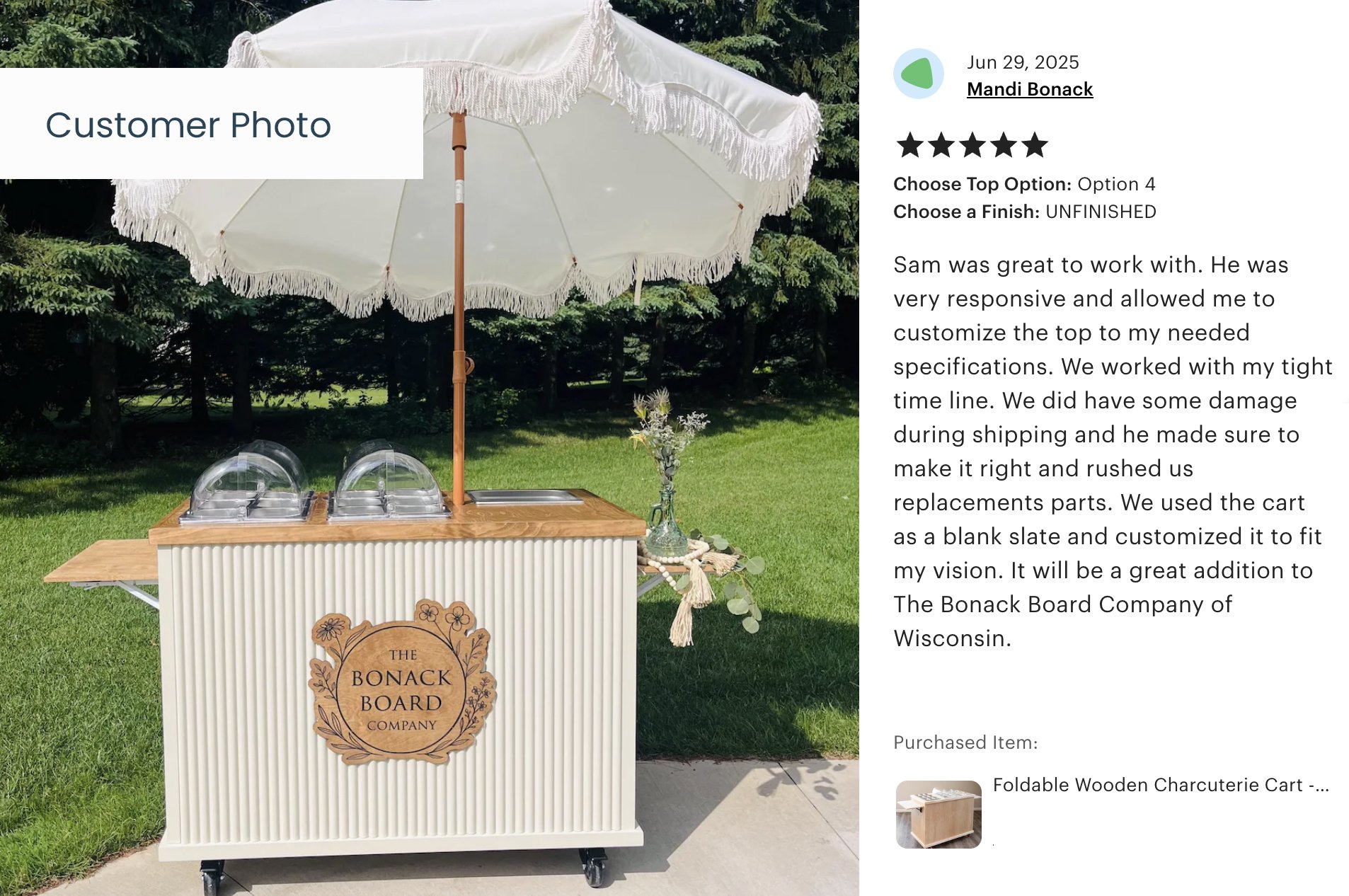 We start by gathering all the details — your style preferences, dimensions, intended use (grazing table, beverage station, outdoor events, etc.), and any special requirements. The more you share, the better we can tailor your cart to exactly what you need.